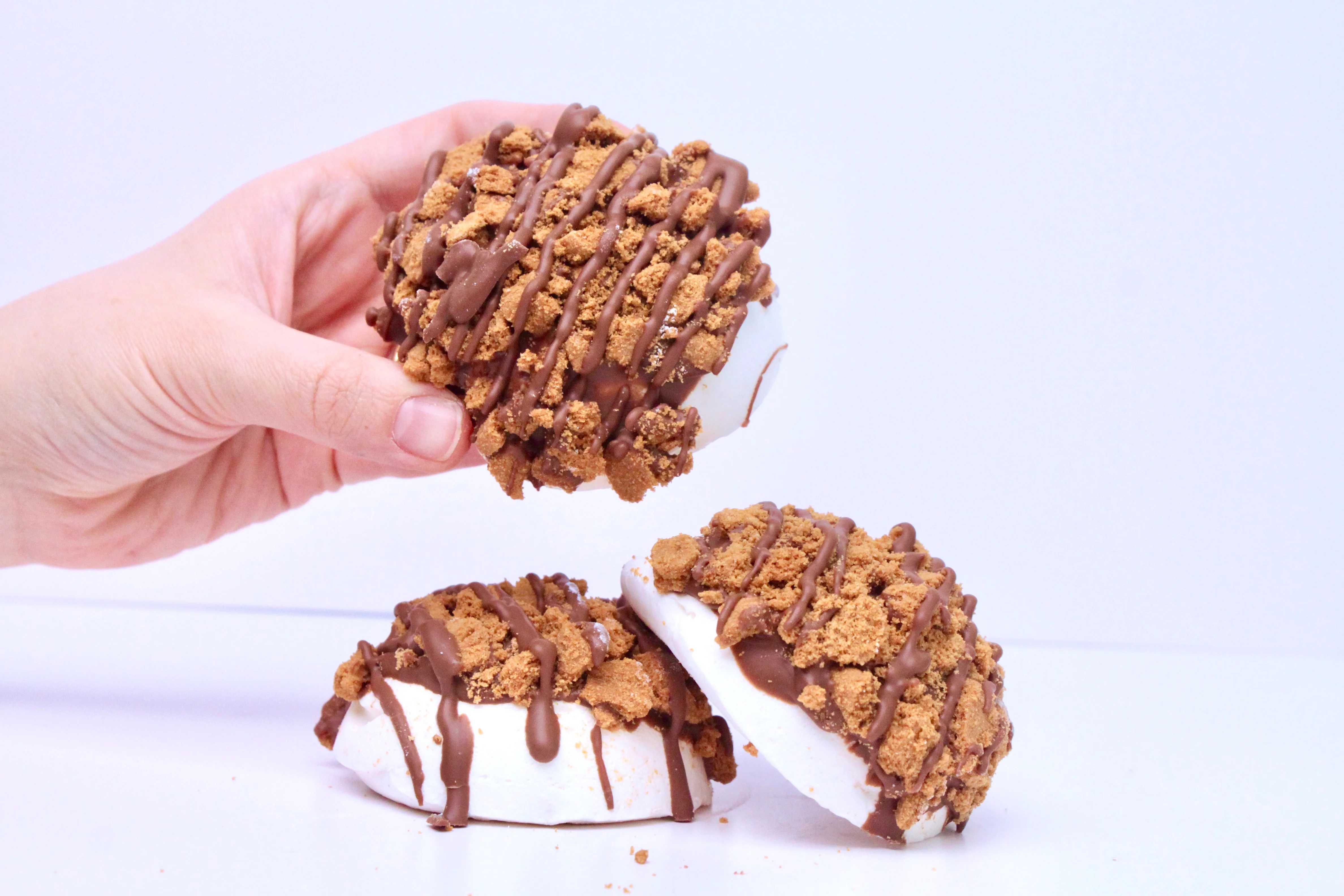 It all starts with a fluffy vanilla marshmallow dome, hiding a gooey Biscoff center that melts into pure happiness. Then we dip it in smooth milk chocolate, sprinkle it with crushed Biscoff biscuits, and finish it off with a rich milk chocolate drizzle - because more chocolate is always a good idea.
